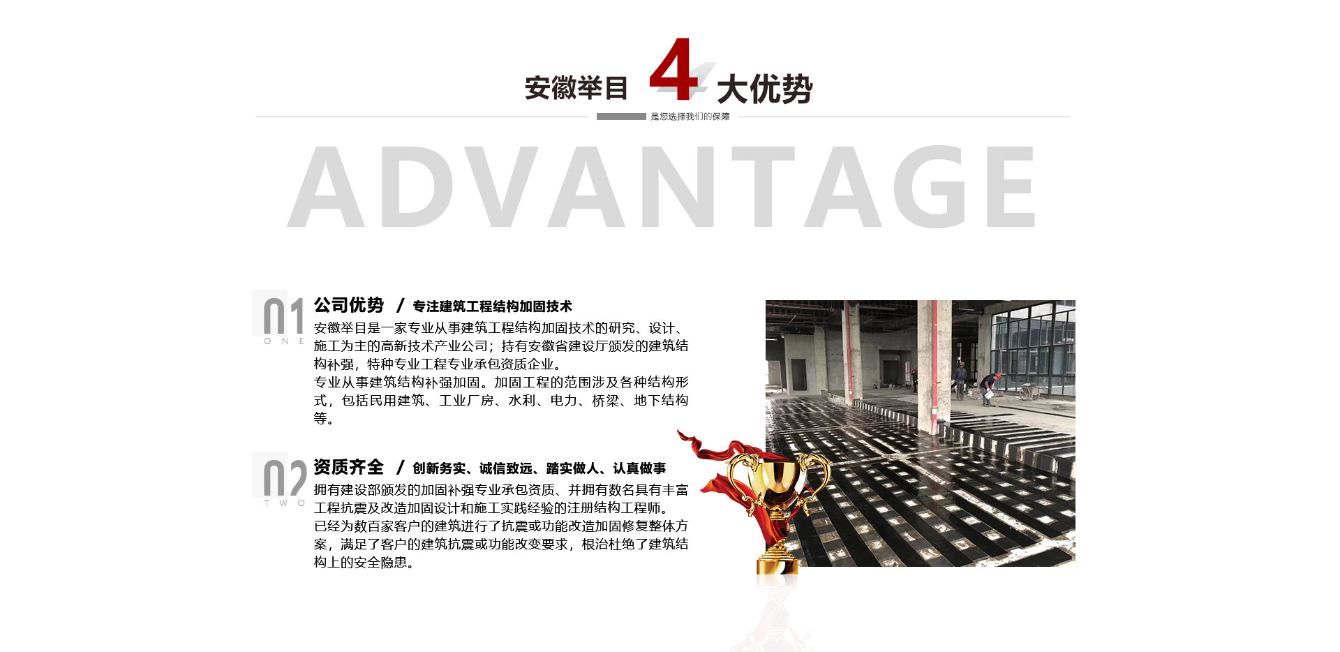 安徽舉目工程加固有限公司是一家專業(yè)從事建筑工程結(jié)構加固技術的研究、設計、施工為主的高新技術產(chǎn)業(yè)公司,成立于2012年。持有安徽省建設廳頒發(fā)的建筑結(jié)構補強,特種專業(yè)工程專業(yè)承包資質(zhì)企業(yè)。專業(yè)從事建筑結(jié)構補強加固。加固工程的范圍涉及各種結(jié)構形式,包括民用建筑、工業(yè)廠房、水利、電力、橋梁、地下結(jié)構等。公司依托高校土木建筑學院、省建筑科學研究機構專業(yè)從事建筑結(jié)構加固、檢測、鑒定、設計、施工、公司擁有建設部頒發(fā)...